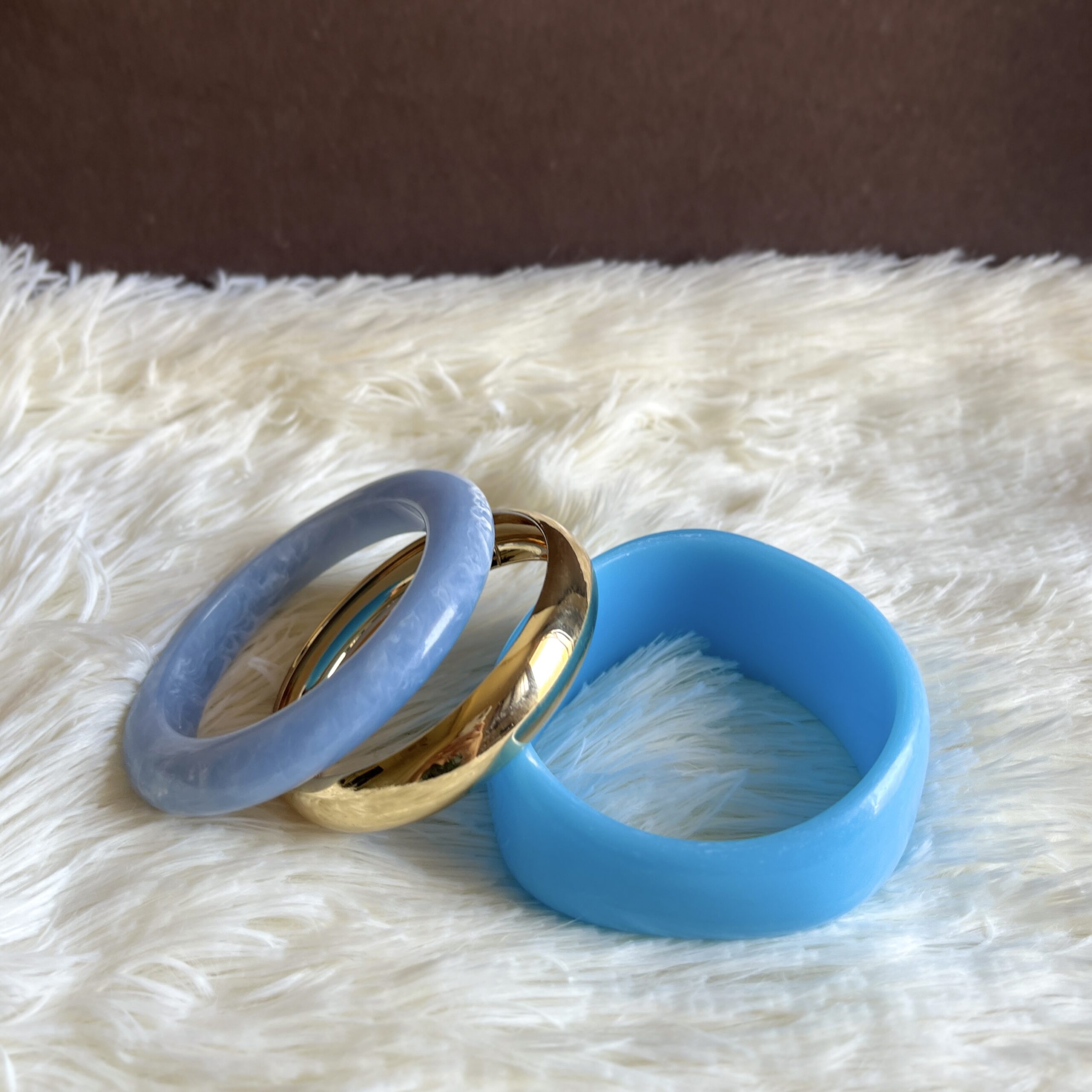 A refreshing pop of color with a luxe touch. The Blue Horizon Resin Stack combines vibrant blue resin with a sleek gold bangle, creating a bold yet sophisticated statement for modern styling.