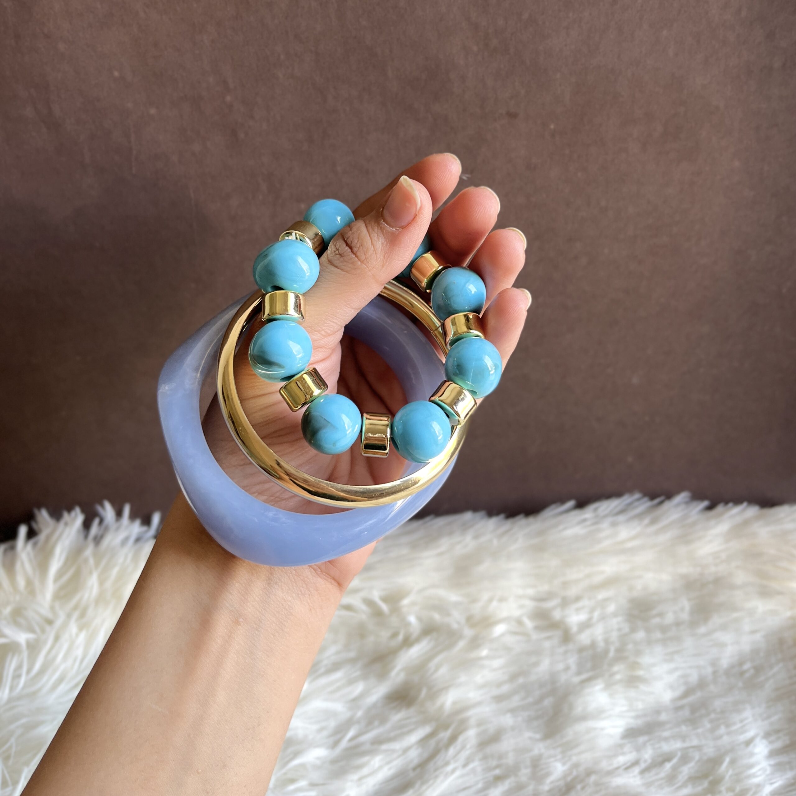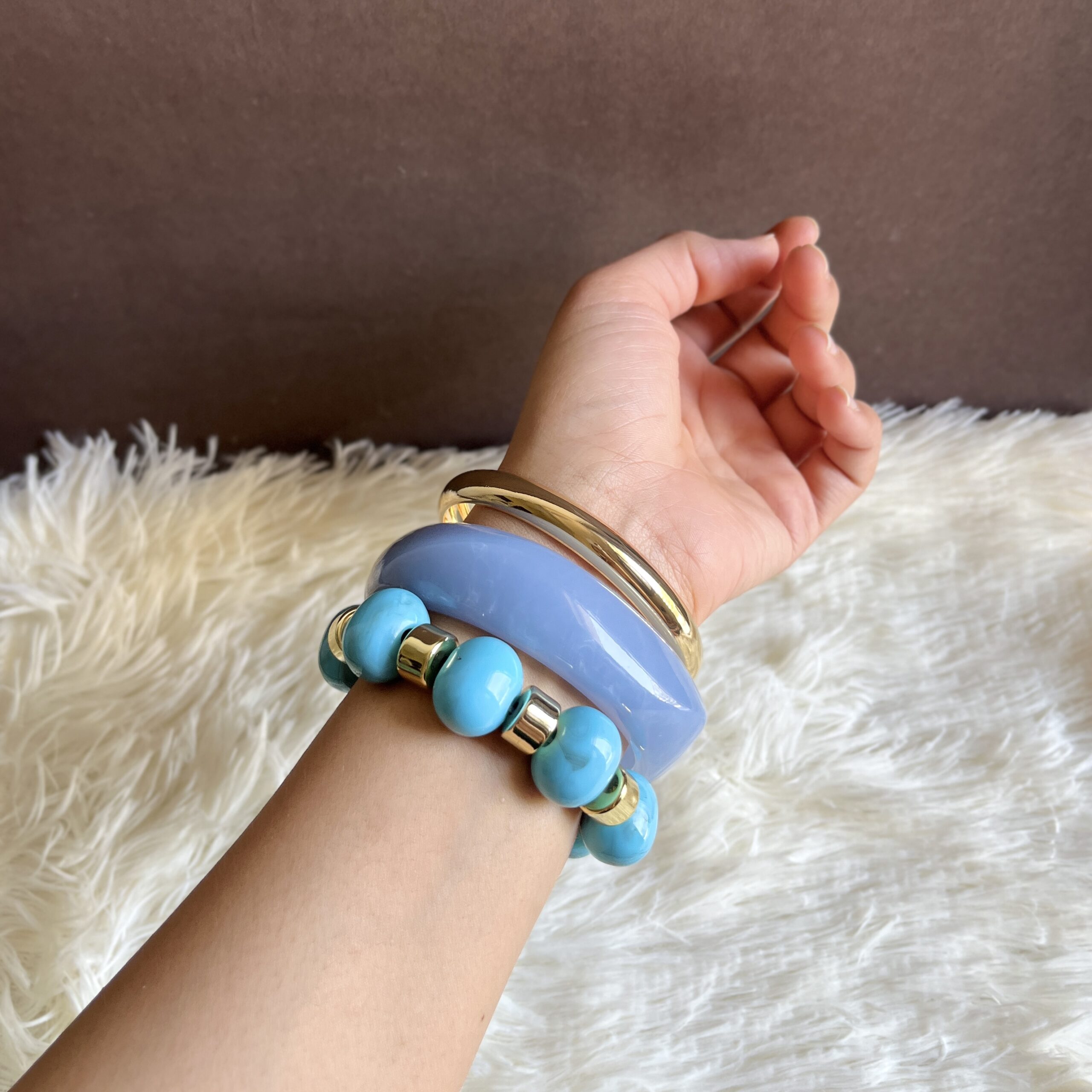 Playful yet chic, the Coastal Candy Resin Stack features soft blue tones paired with bead accents for a fun layered look. Perfect for adding a vibrant touch to summer outfits.