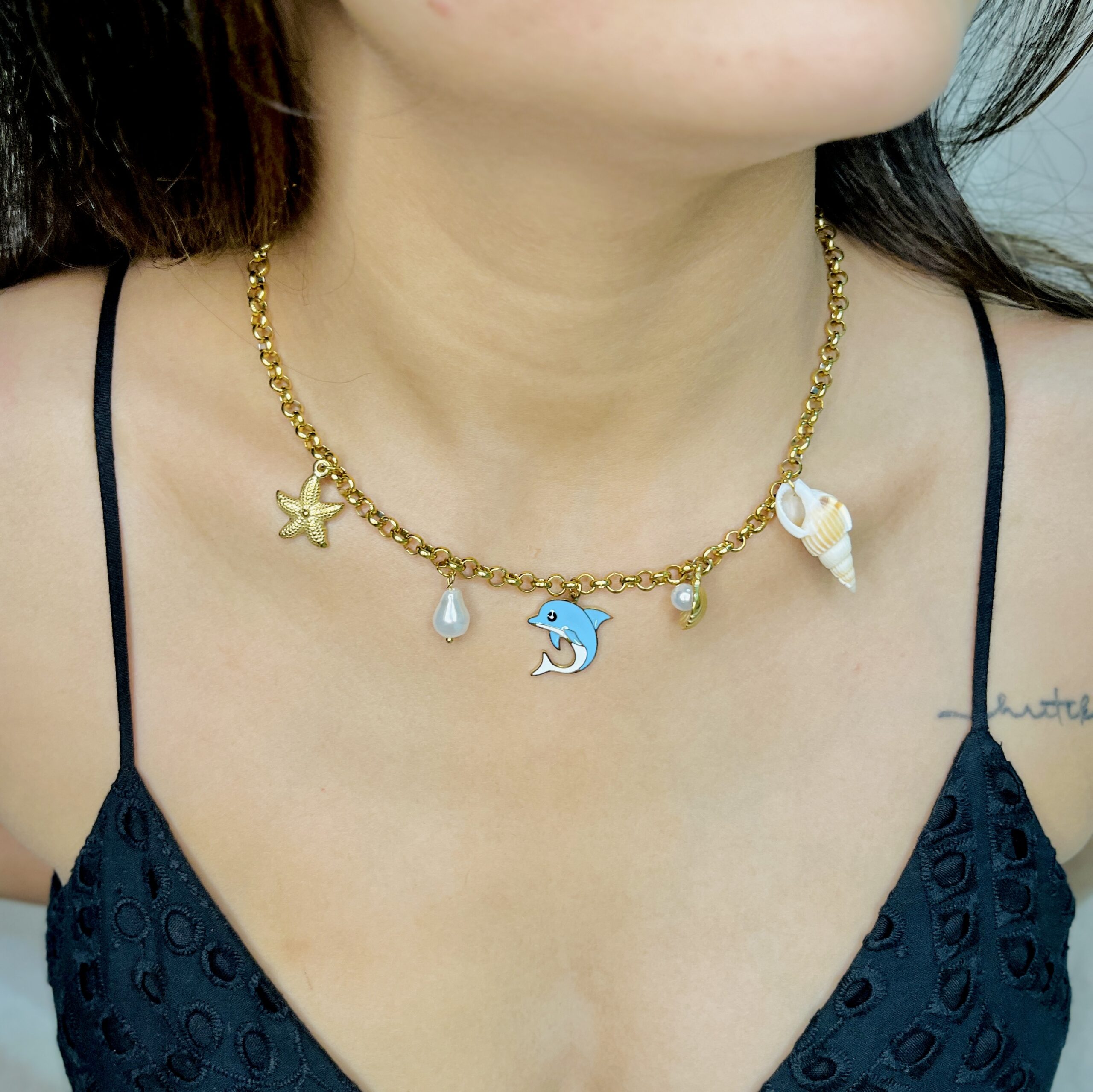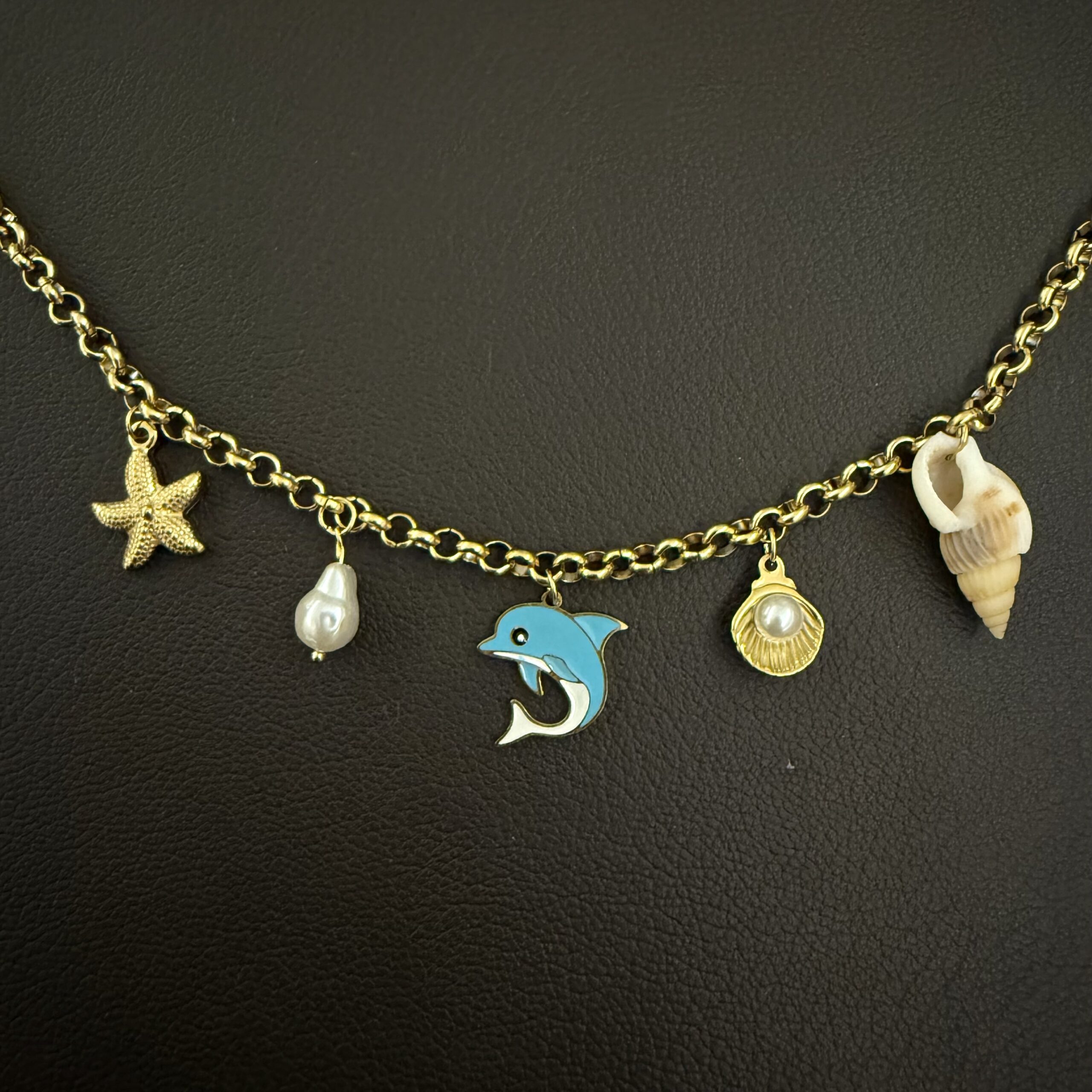 Dive into coastal vibes with the Dolphin Shell Charm Necklace featuring a playful mix of dolphin, starfish, shell, and pearl charms. Its gold-plated chain captures the spirit of summer while adding a luxe touch — perfect for beach vacations or casual chic days.