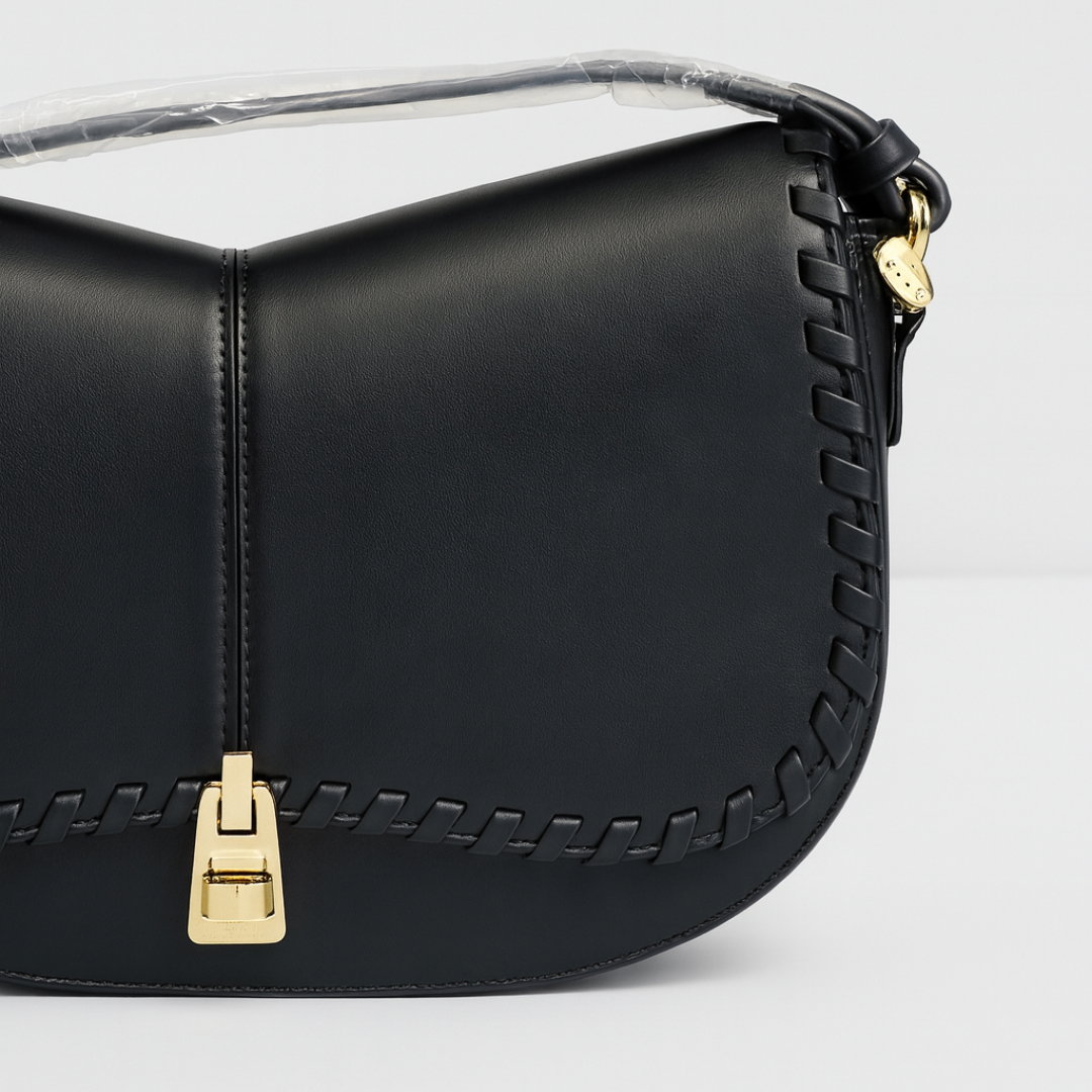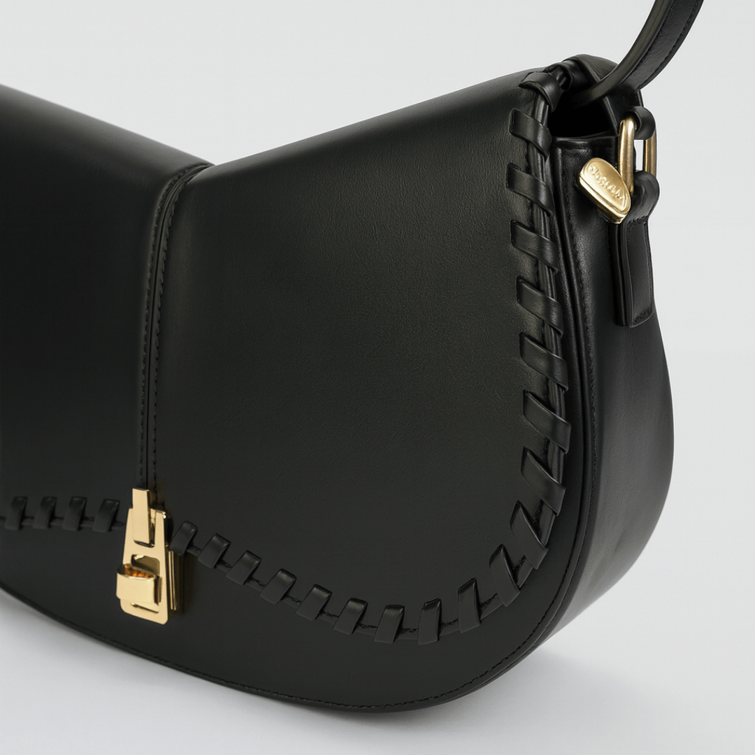 A sleek and versatile handbag crafted from premium black faux leather, designed for both elegance and functionality. The bag features intricate whipstitch edging, a structured silhouette, and polished gold-tone hardware that adds a touch of luxury.