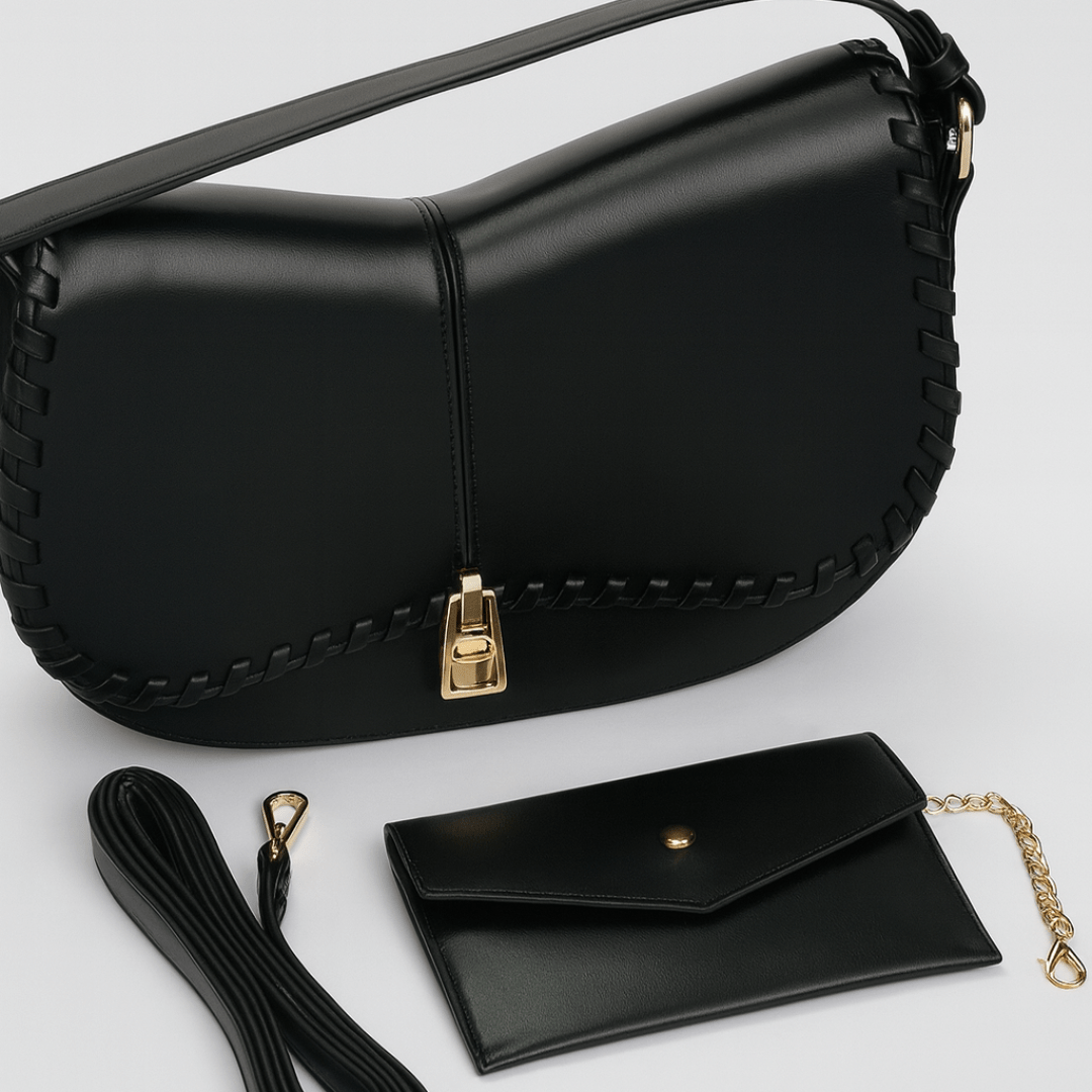 This set comes with detachable long sling strap that allows you to wear it crossbody and complemented by a matching envelope pouch with a gold chain — perfect for organizing cards, cash, or small accessories. A must-have for women who appreciate both fashion and practicality.