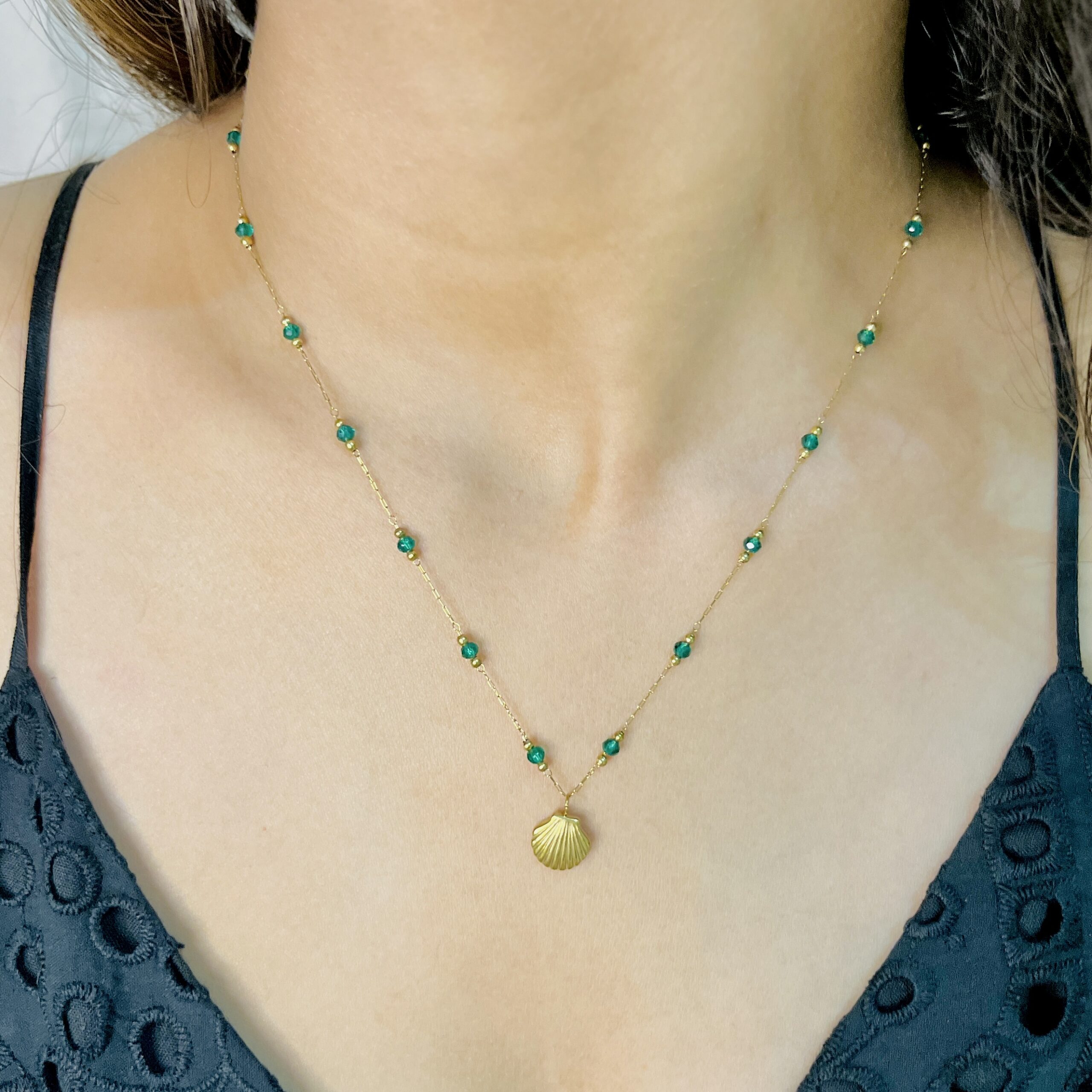 Elevate your look with the Emerald Beaded Seashell Necklace — a delicate fusion of coastal charm and modern minimalism. The deep green beads paired with a golden shell pendant bring a refreshing ocean-inspired elegance to any outfit.