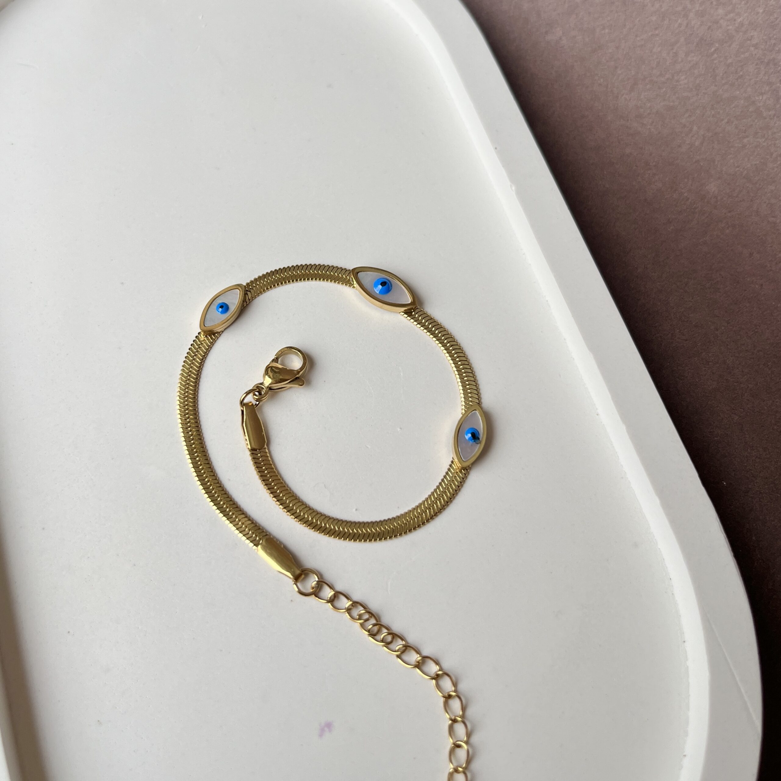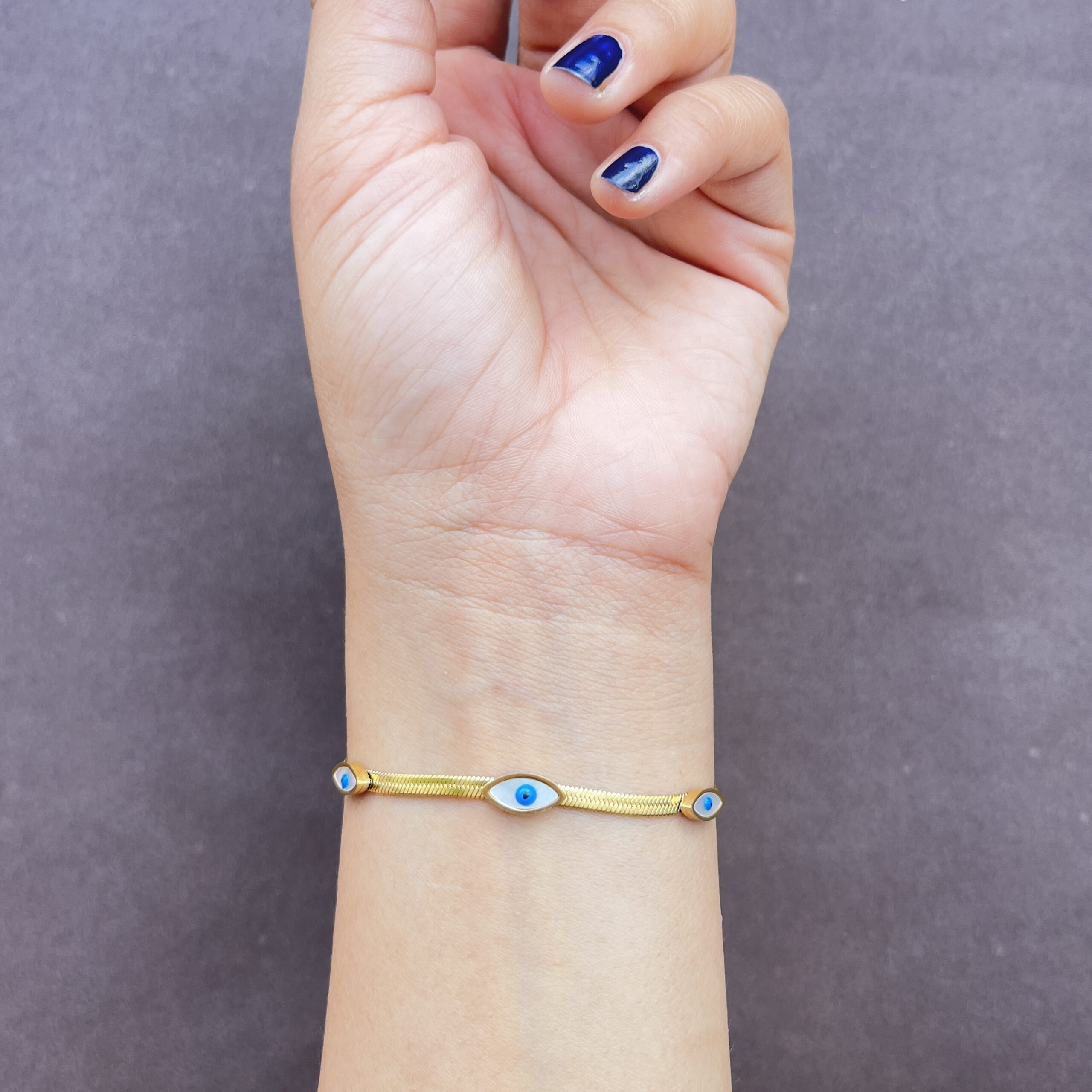 Add a touch of protection and elegance with this Evil Eye Gold Bracelet, designed to keep bad vibes away while enhancing your style. Its sleek gold chain with striking blue evil eye charms makes it perfect for everyday wear.
