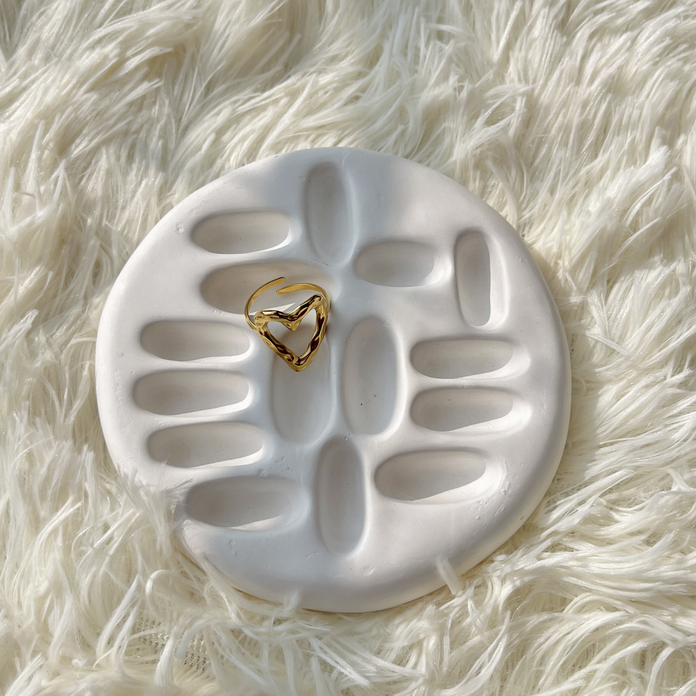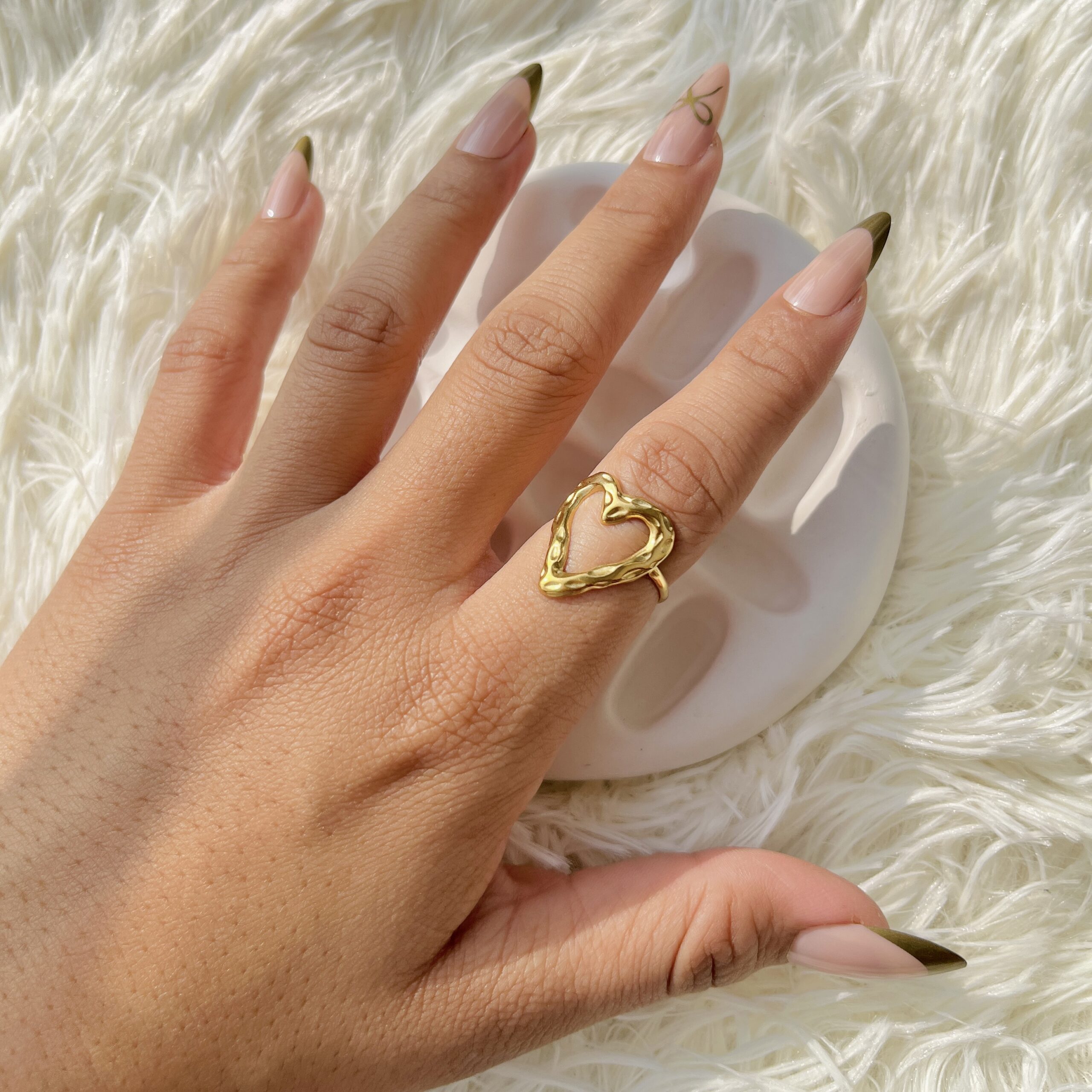 A chic, open-heart ring with a fluid “molten” silhouette that catches the light from every angle. Wear it solo for a minimalist statement or stack it with your favorites for a layered, romantic look.