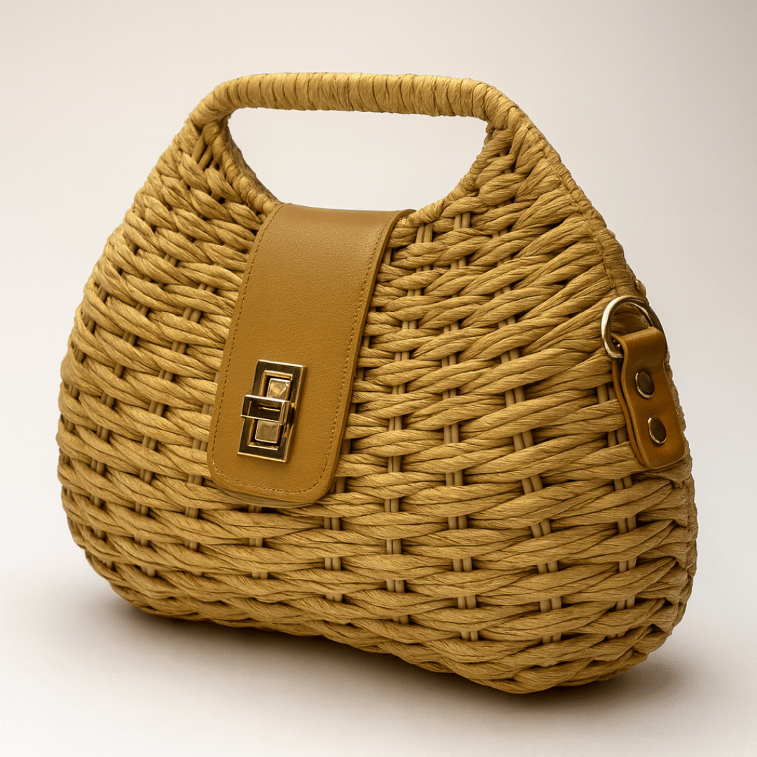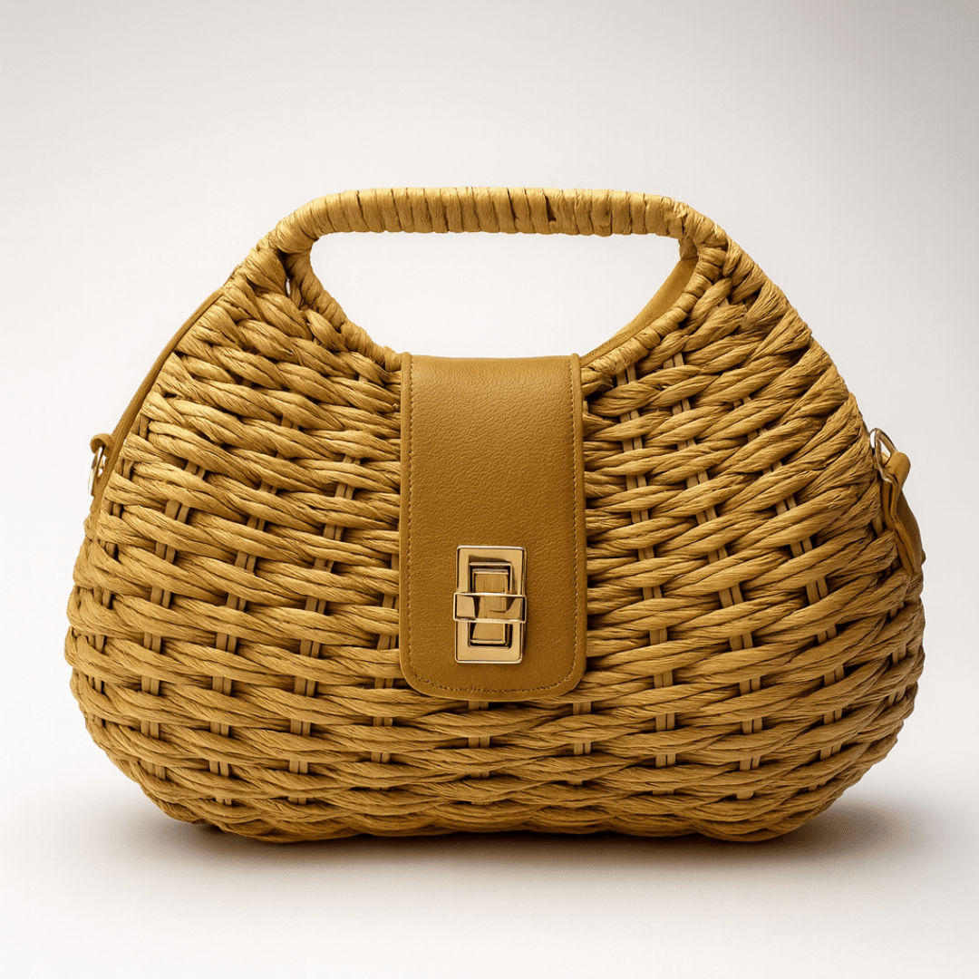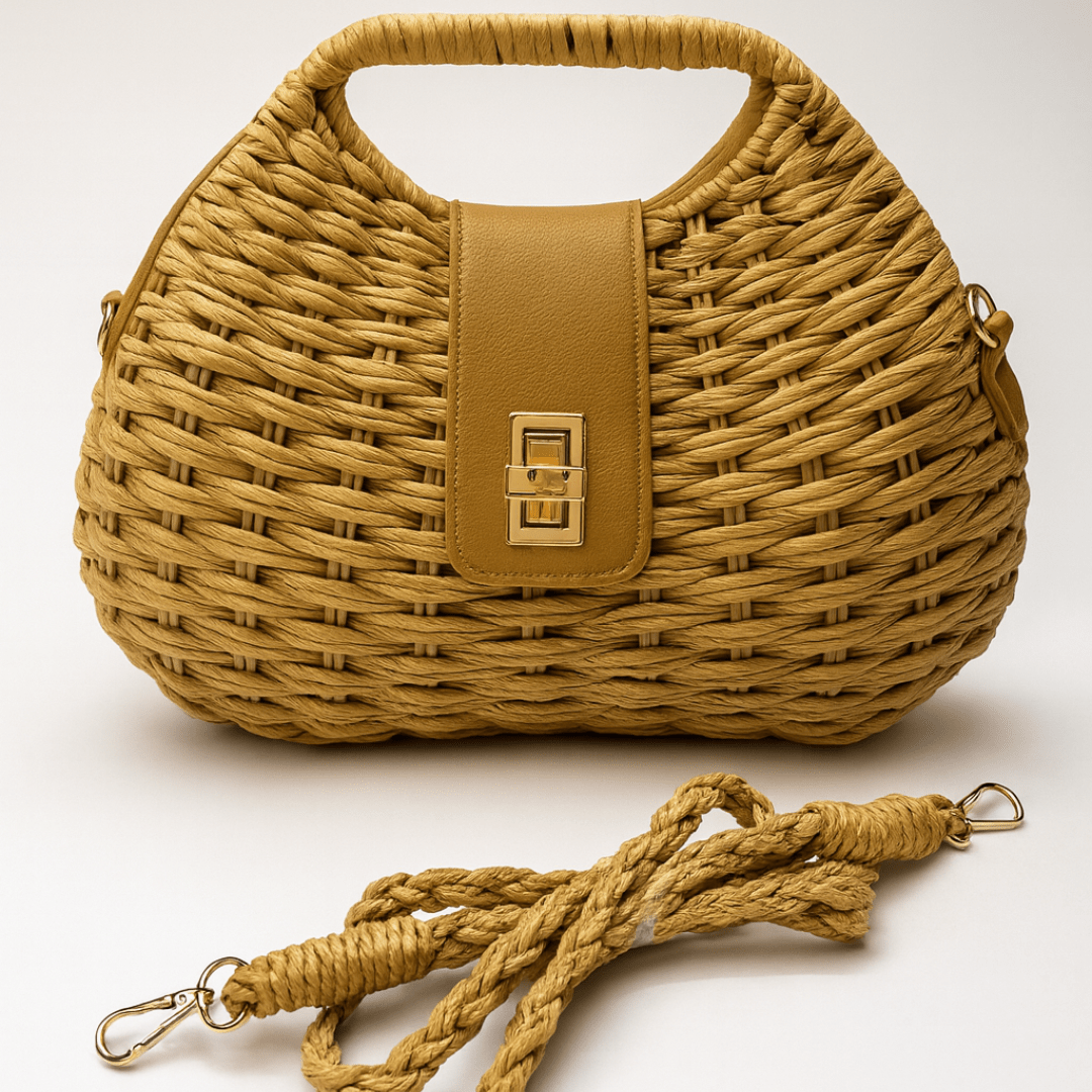 This handcrafted woven straw handbag is a blend of natural charm and modern style. Designed with a sturdy top handle, faux leather flap, and a secure twist-lock closure, it comes with a detachable sling strap for versatile use. Lightweight yet spacious, it’s perfect for brunch outings, vacations, beach trips, or everyday chic looks.