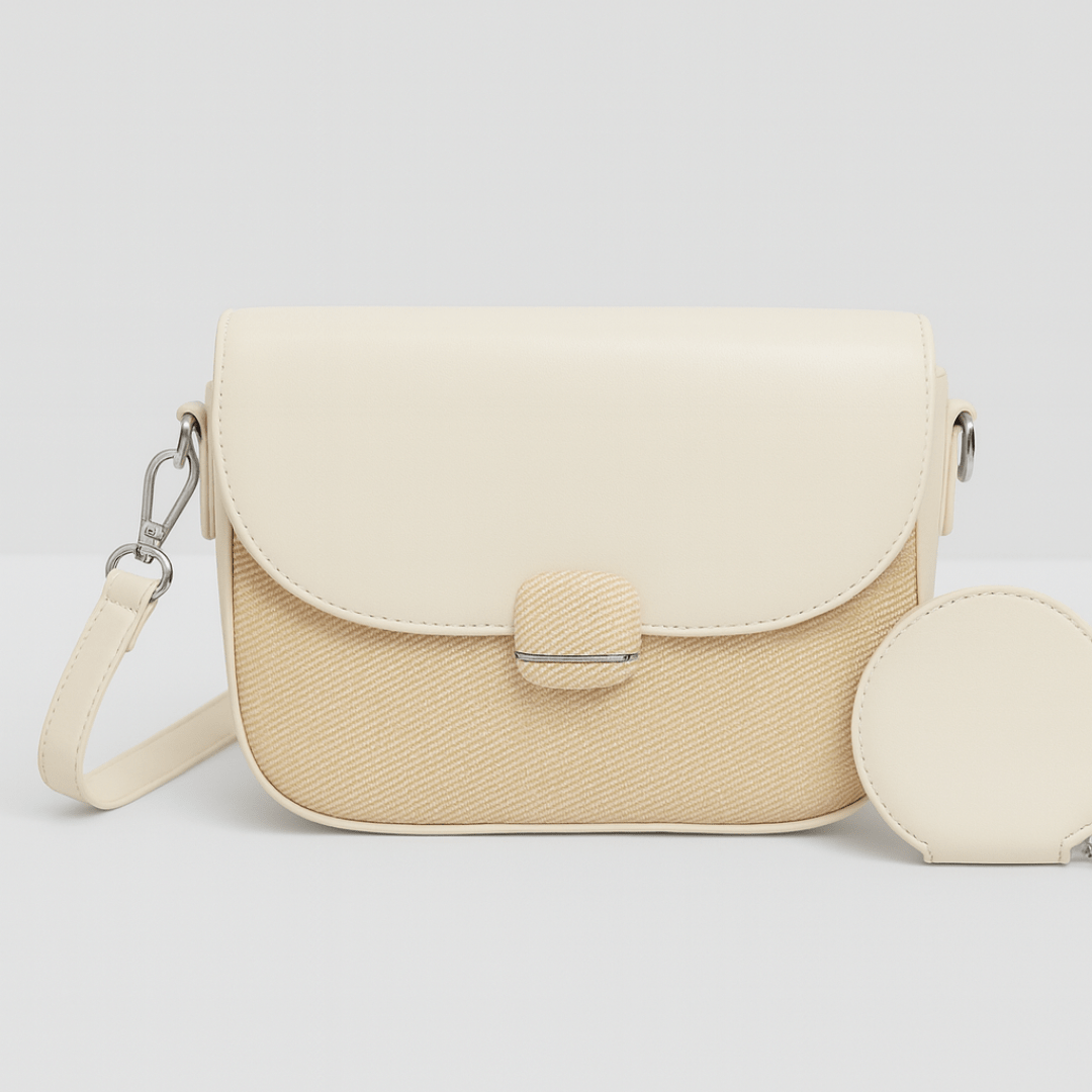 Add a touch of ivory beige elegance to your wardrobe with this chic crossbody handbag. Designed with a textured fabric base and smooth faux leather flap, it comes with a detachable sling strap and a matching mini pouch to keep your essentials organized. Compact yet spacious, this bag is perfect for daily outings, shopping trips, or casual evenings.
