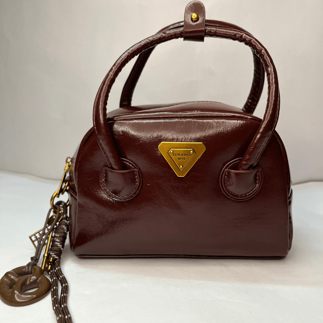 This D-shaped satchel bag speaks pure elegance. The Luxe Wine Gloss Satchel comes in a rich glossy wine finish with a structured silhouette, dual top handles, and a detachable sling strap for versatile styling. The playful dangling charms paired with gold-tone hardware add a luxe edge, making it the perfect companion for brunches, evenings, and chic outings.