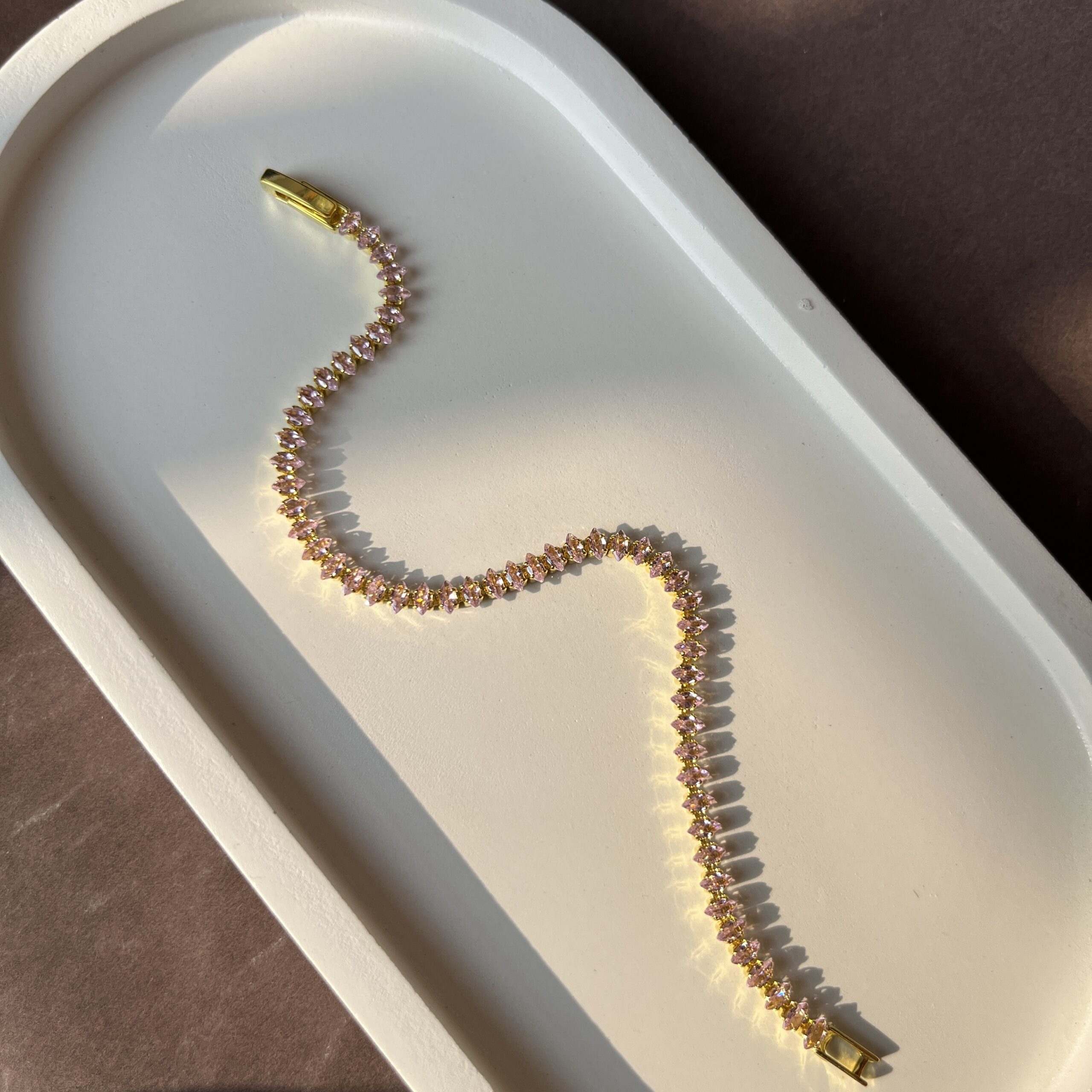 A delicate pink tennis bracelet designed for subtle sparkle and effortless elegance. Ideal for everyday wear or soft, feminine styling.