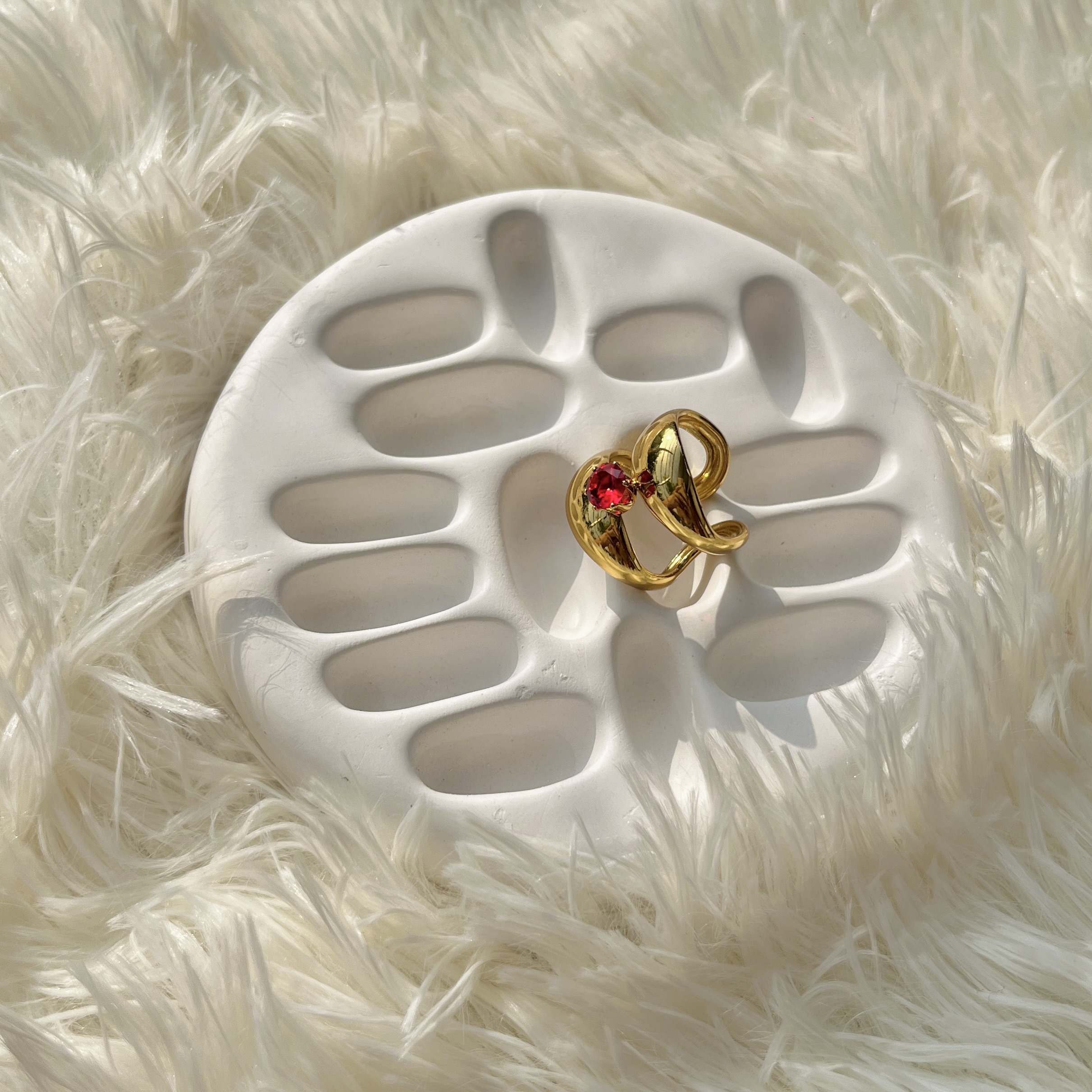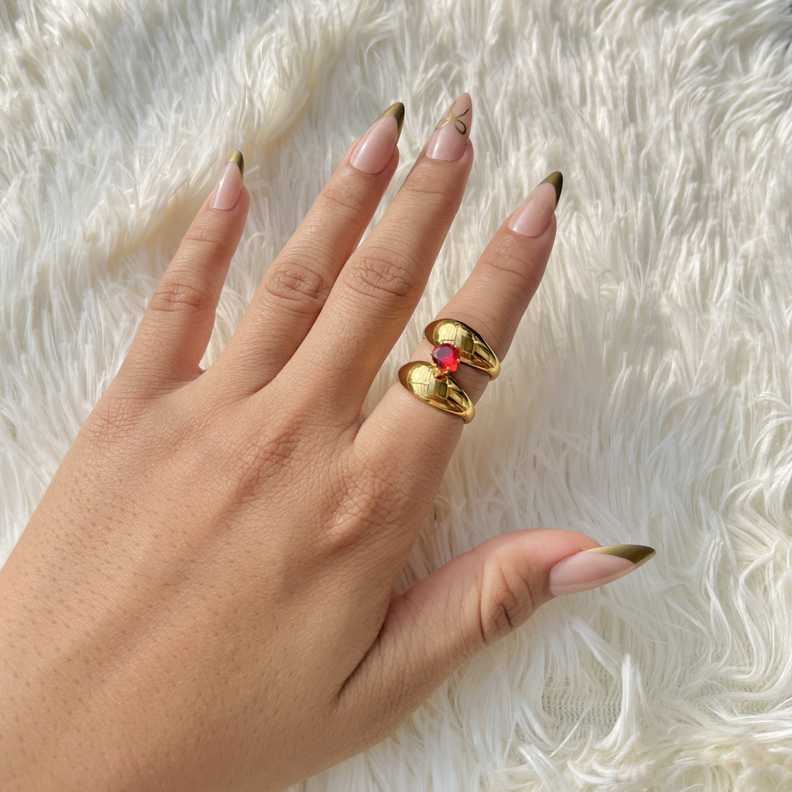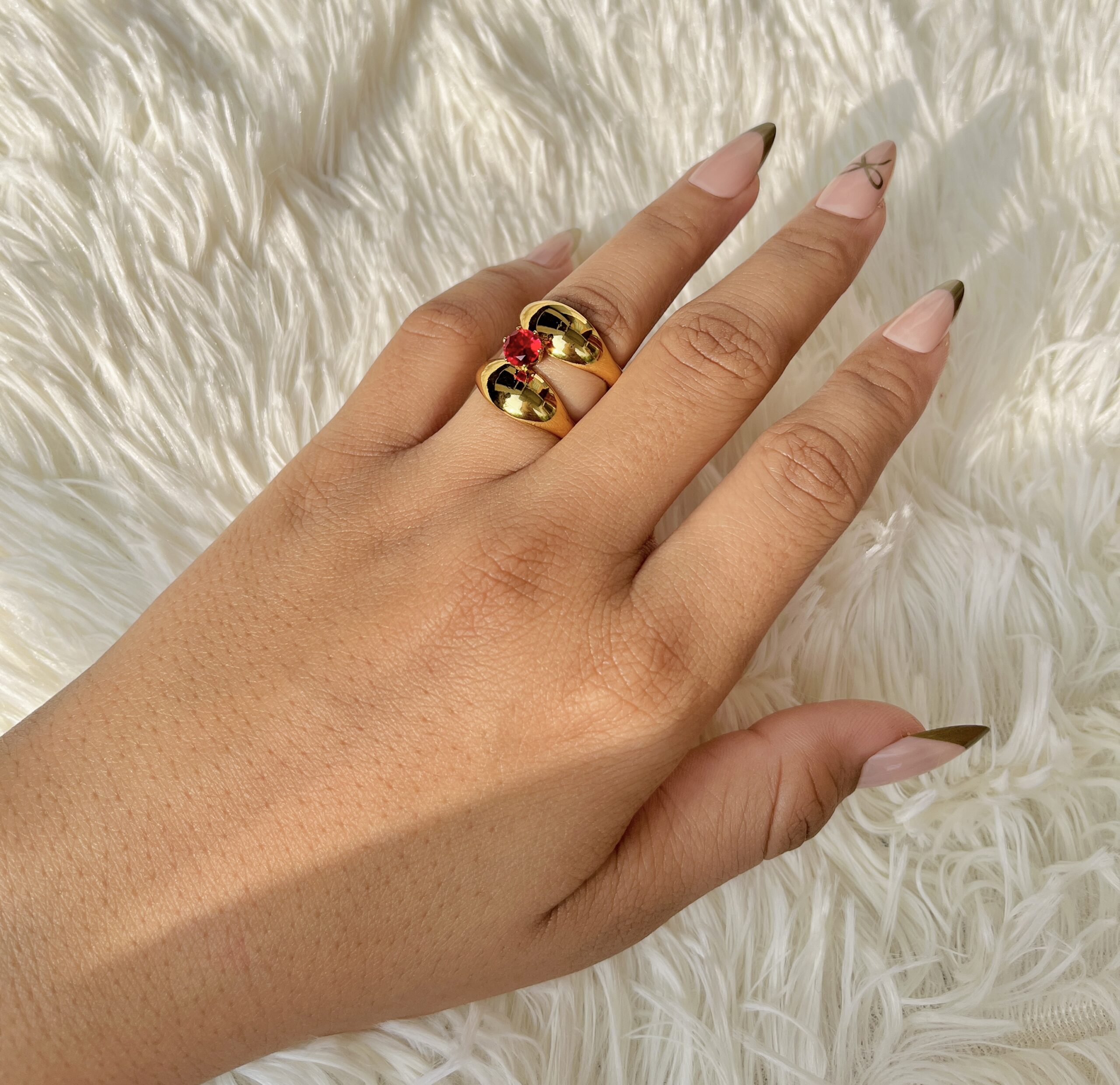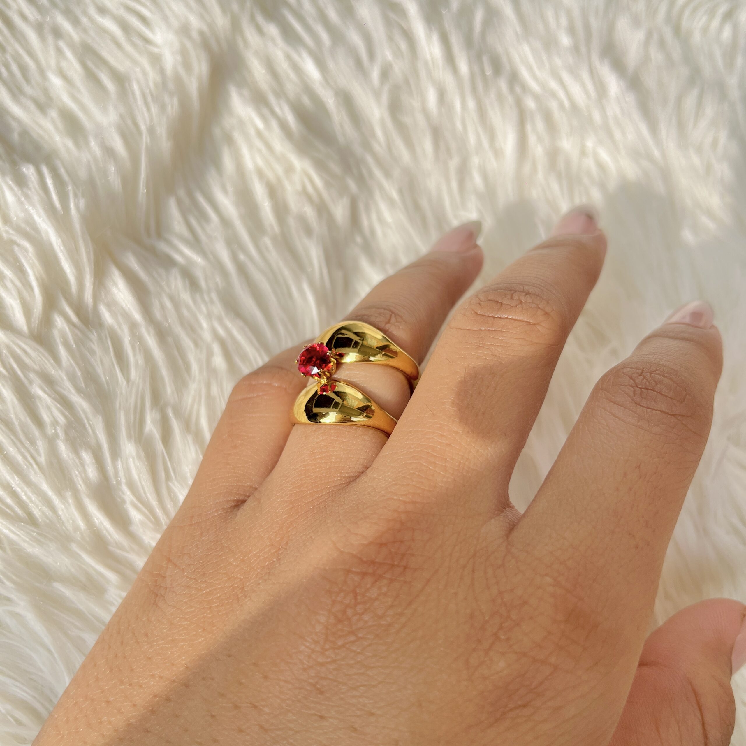 Make a statement with this bold ring featuring a stunning red stone centerpiece. Designed with a high-polish finish, this ring adds a touch of sophistication to any look — perfect for both casual and festive wear.