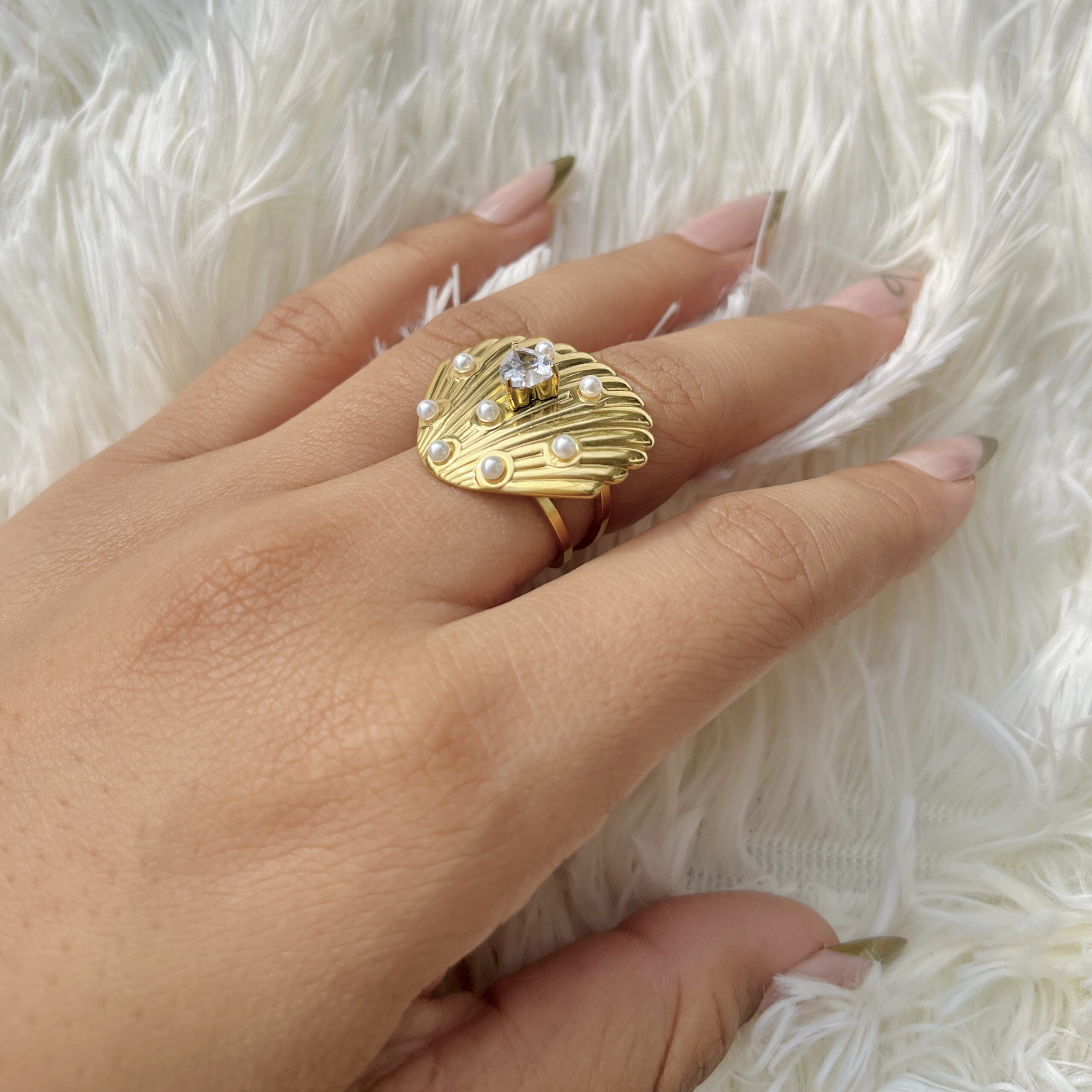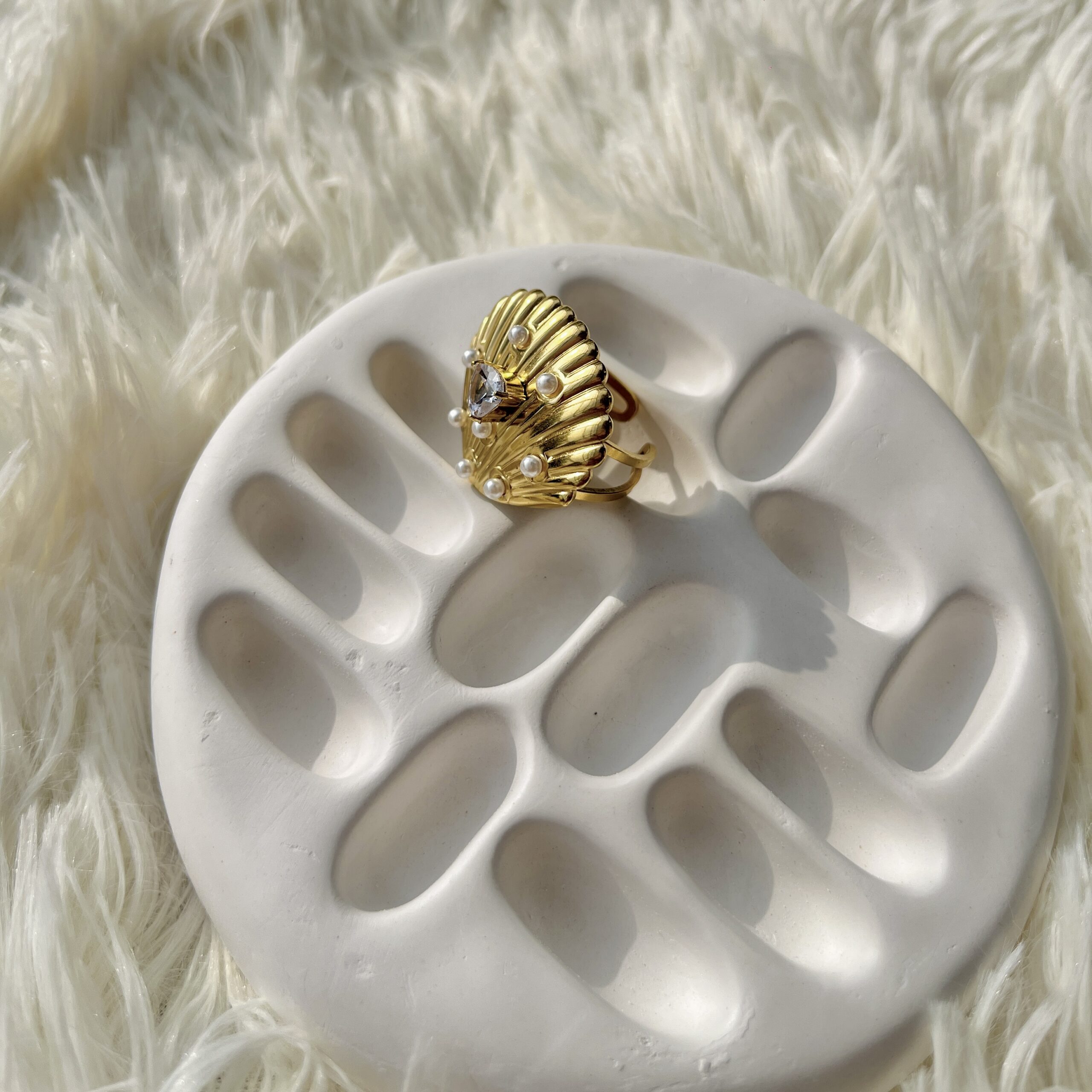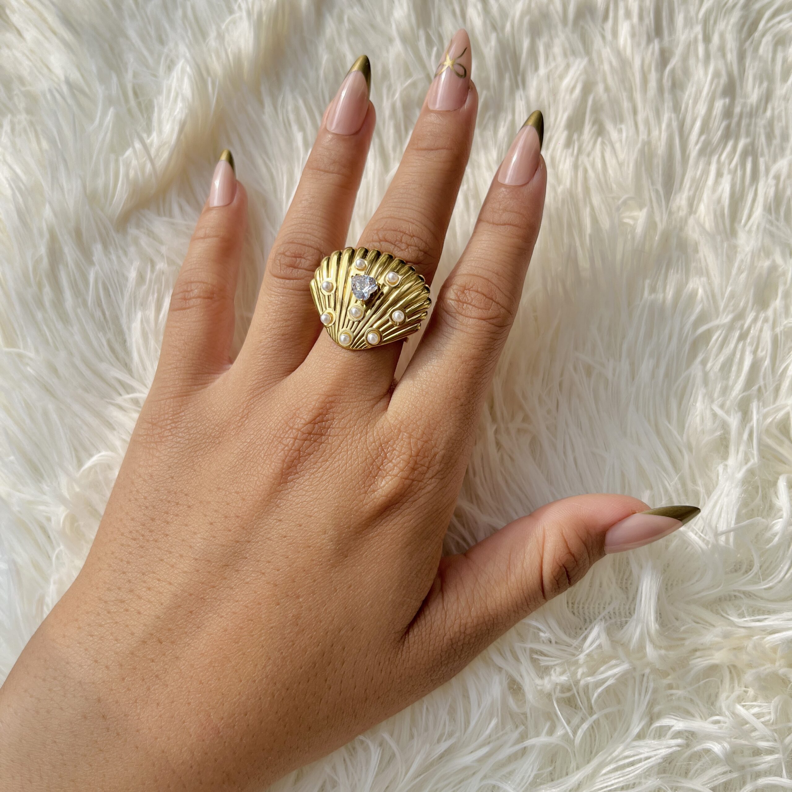 Channel oceanic elegance with this Golden Sea shell Statement Ring, crafted to make you stand out effortlessly. Adorned with delicate detailing and a central crystal accent, this ring blends coastal charm with a luxe finish — perfect for brunches, vacations, or evening wear.