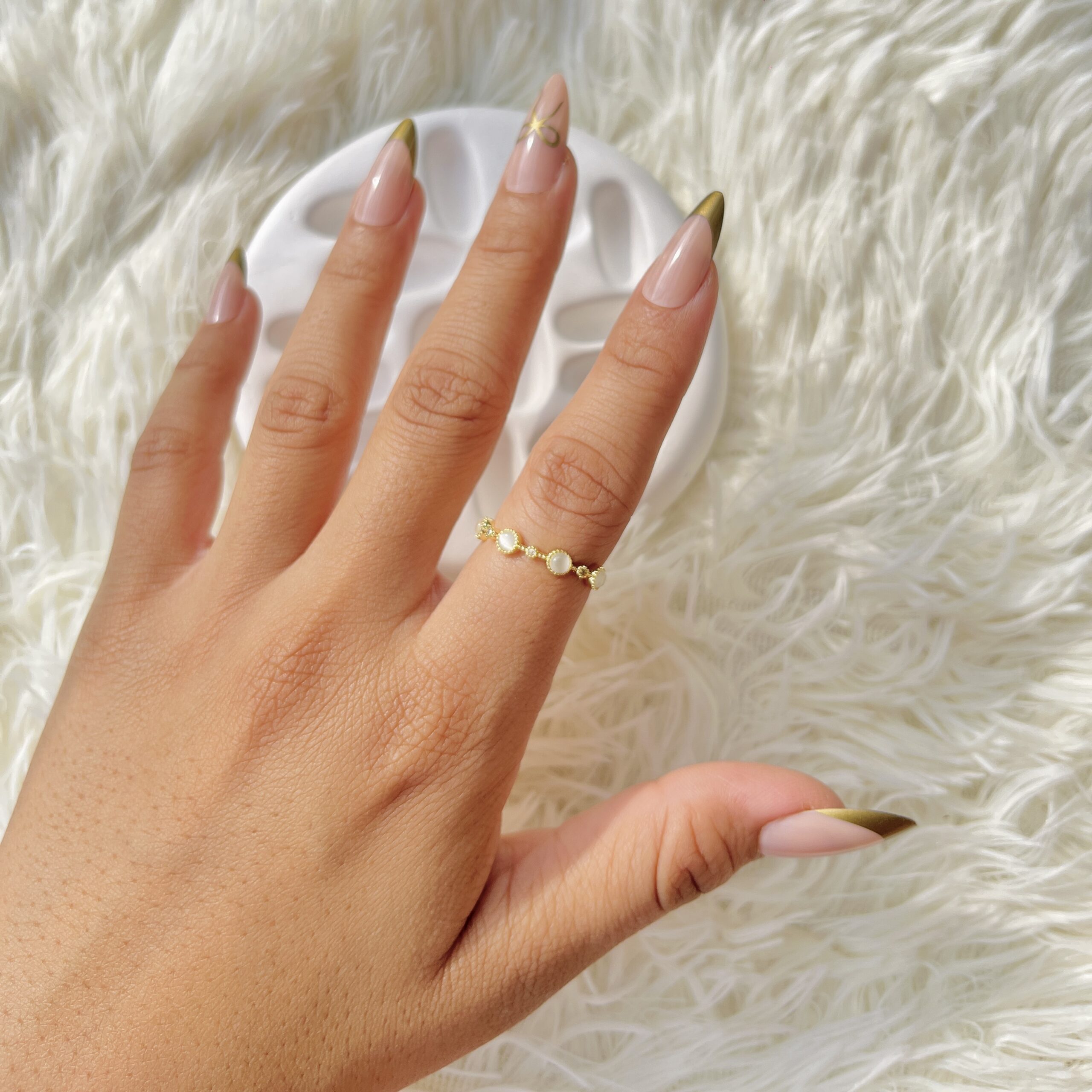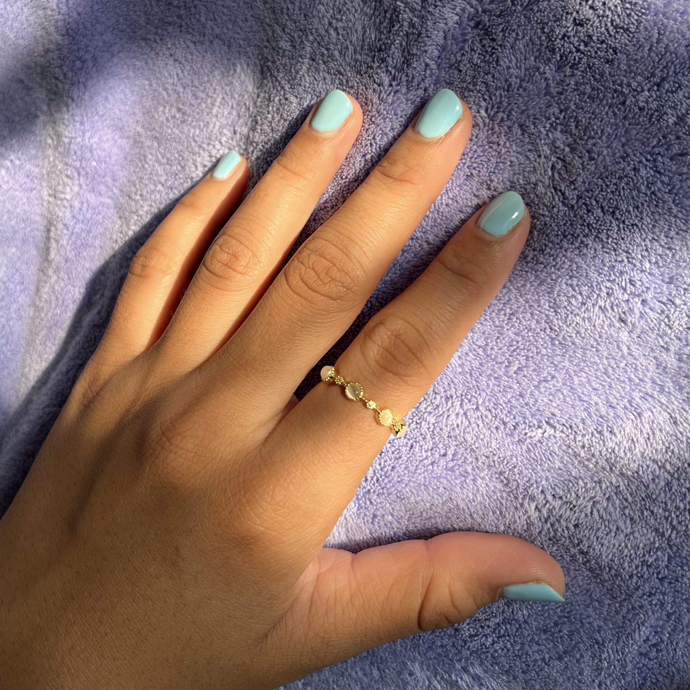 Minimal and chic, this gold-toned adjustable ring features a delicate beaded design with tiny disc accents. Its simple elegance makes it perfect for layering with other rings or wearing solo for a subtle statement. With its anti-tarnish finish, it’s a versatile piece that suits both casual and dressy looks.