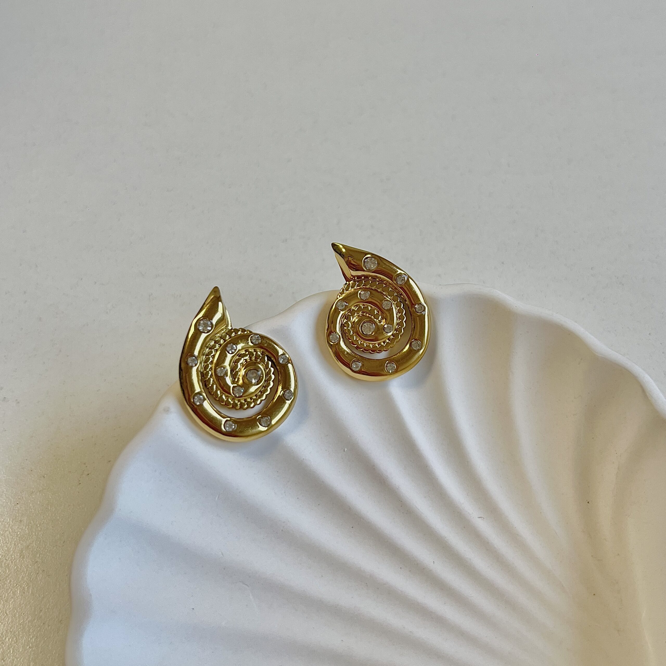 Inspired by the beauty of ocean treasures, these Spiral Shell Stud Earrings bring a luxurious coastal charm to your style. Embellished with delicate crystals and finished in radiant gold, they’re the perfect blend of elegance and artistry.