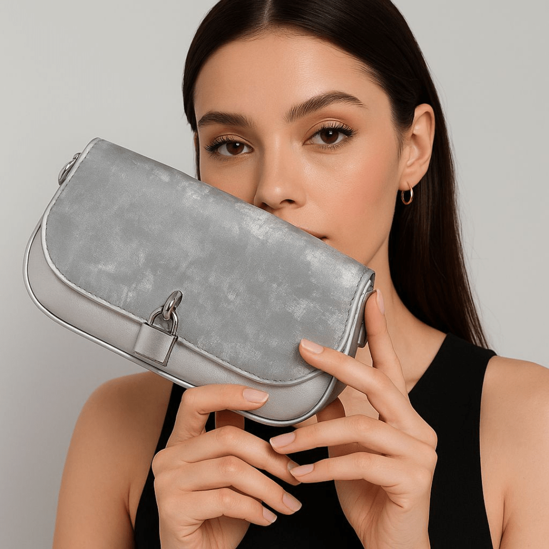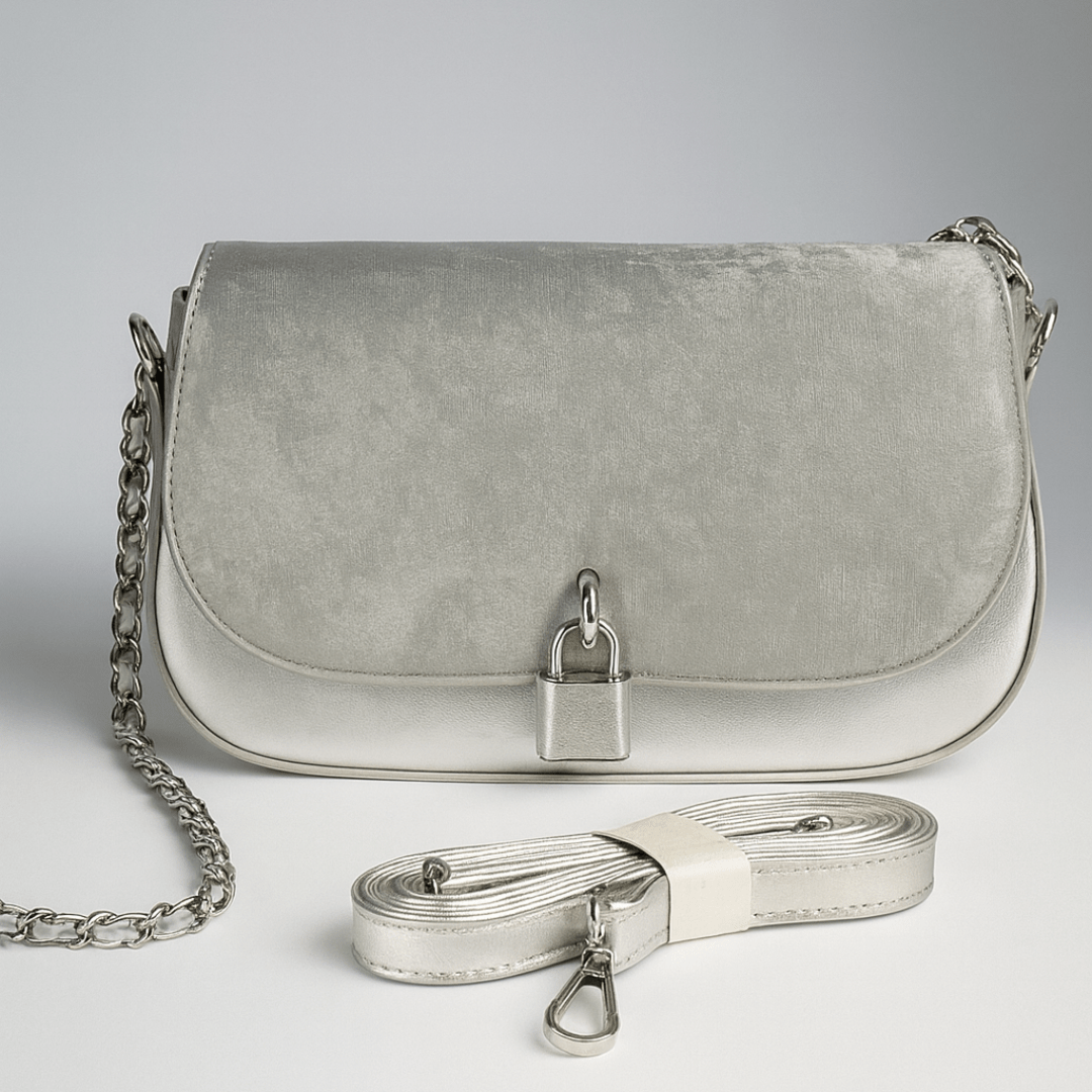 Add elegance to your look with this stylish silver handbag, crafted with a sleek metallic finish and a modern lock accent on the flap. The bag comes with two interchangeable straps to suit your style and occasion. One Shoulder Strap (Metal Chain with faux leather) and Crossbody Sling Strap (Adjustable Faux Leather). Compact yet practical, this bag is designed to carry your essentials with ease while keeping you effortlessly stylish.