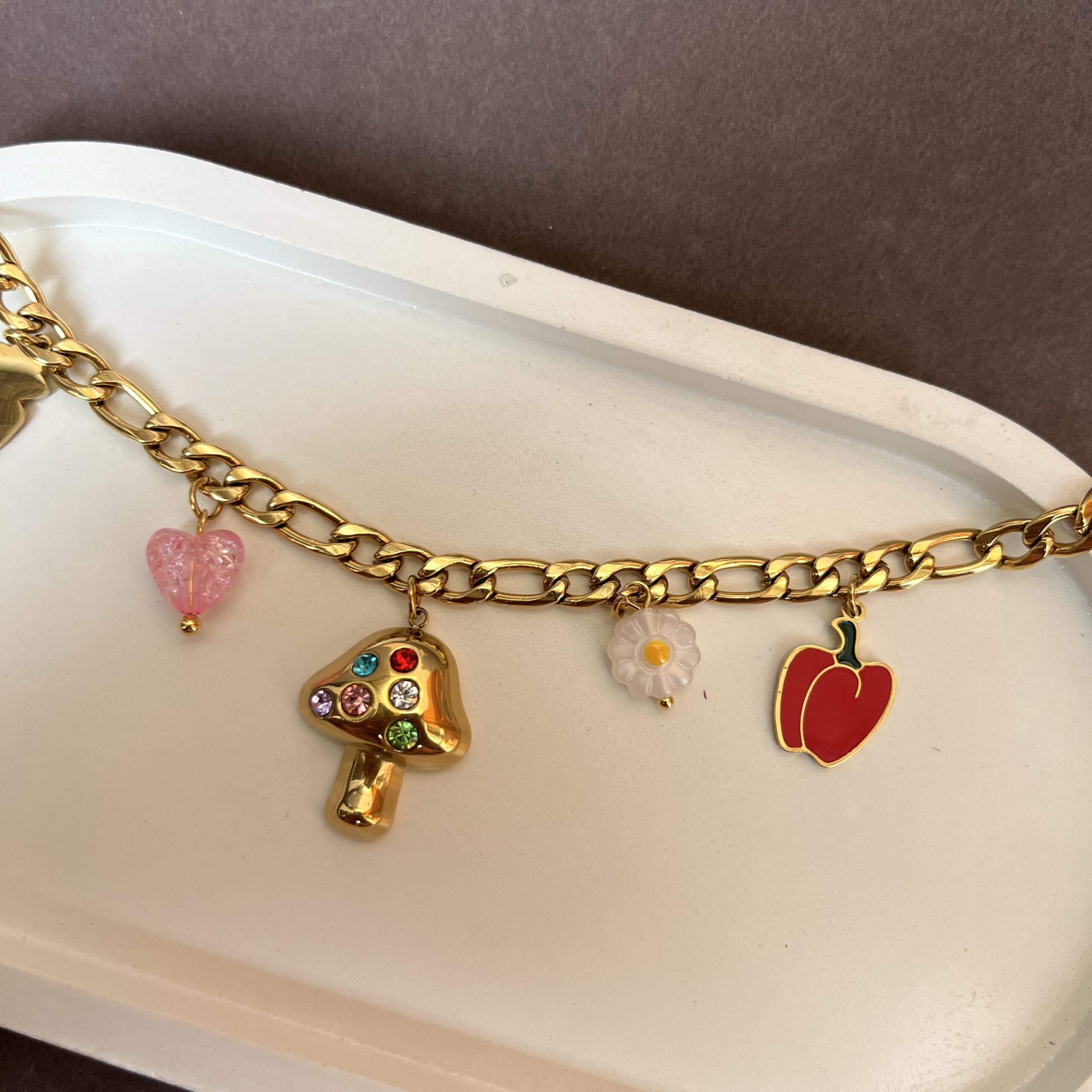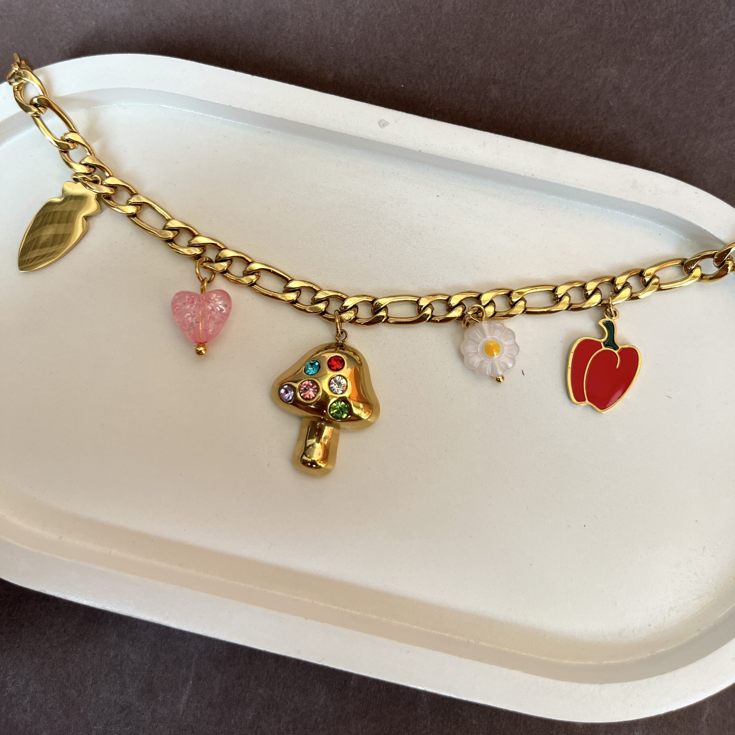 A fun and playful charm bracelet featuring adorable veggie-inspired charms. Designed for Gen-Z styling, this bracelet adds a cute, quirky touch to everyday outfits and makes a perfect conversation piece.